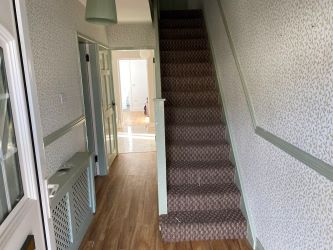 First Floor: Carpeted staircase and landing with hotpress thereof
