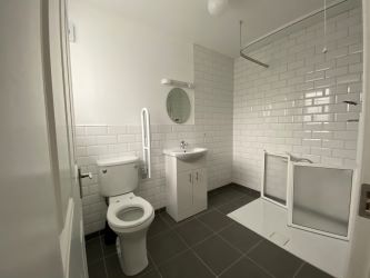 Disabled Accessible Bathroom: 1.7m x 2.6m- Wall to ceiling tiled, wc, whb, disabled accessible Triton shower