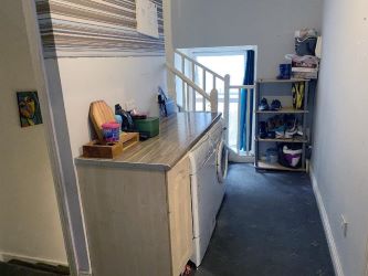 Kitchen/Living: 6m x 3.8m- Built-in units at eye and floor level. Electric over and extractor. Tiled splashback. Timber flooring with tiled kitchen area. Carpeted staircase to 2nd floor