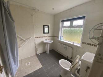 Bathroom: 2.3m x 2.3m - Wet Room with W.C, W.H.B, shower. Wall to ceiling tiled.